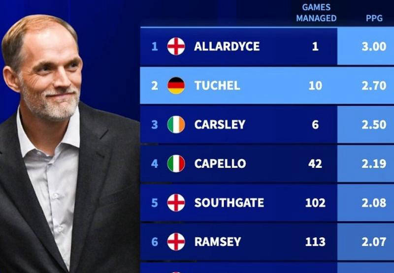 在所有英格兰主帅中,图赫尔的场均积分高达2.7,位列第二,仅次于因丑闻下课但牢牢掌握一场的阿勒代斯。前任卡斯利表现也较为稳健,排名第三,历史上一些著名教头如卡佩罗和索斯盖特也曾担纲英格兰帅位,形成强大竞争背景。