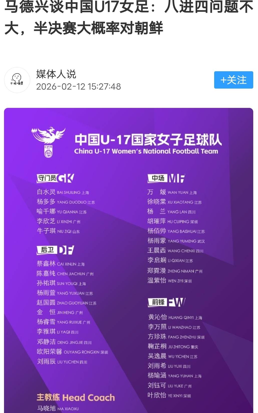这支中国U17女足,由前女足国脚马晓旭担任主教练。体育媒体人认为:中国U17女足拿到A组第一,问题应该不大。“8进4也很有望战胜B组第三或C组第三,拿到U17世界杯参赛资格”。线女足可能是半决赛,到时大概率可能跟朝鲜U17交手。